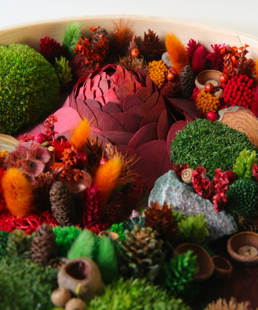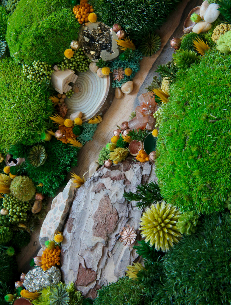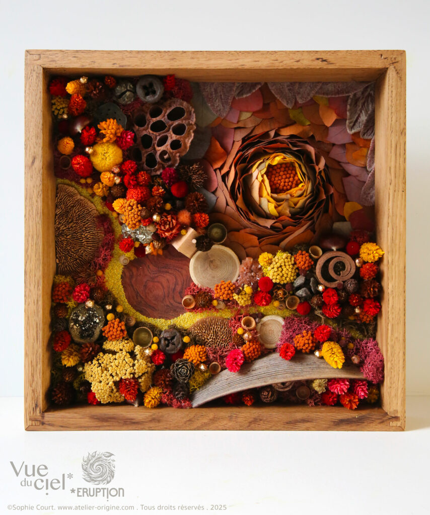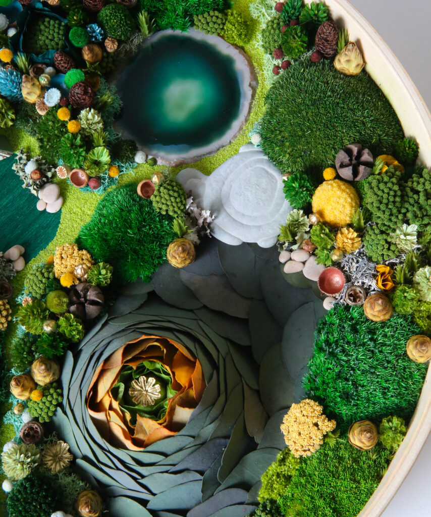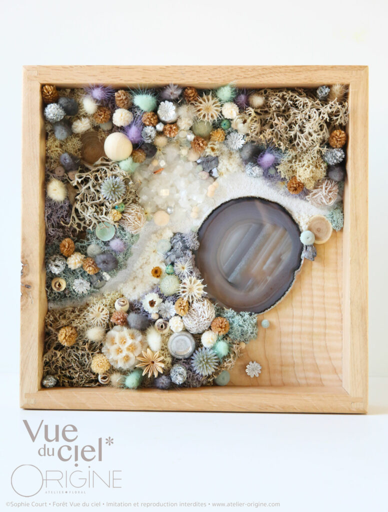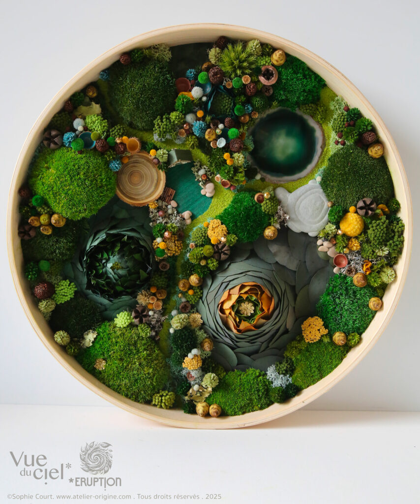 Composées de mousses, lichens, végétaux stabilisés, fleurs séchées, et enrichies d’éléments naturels comme graines, bois, fruits séchés, sable naturel et minéraux, ces œuvres offrent une interprétation poétique et détaillée de la nature.