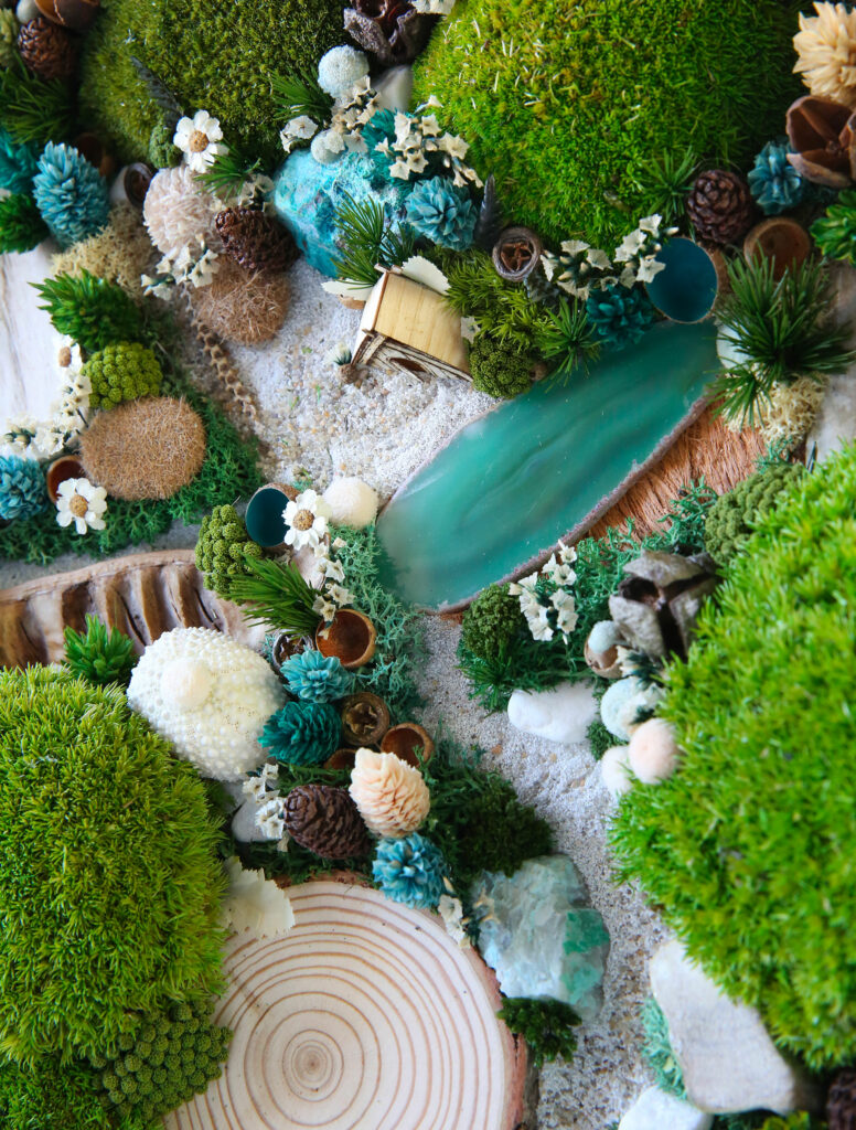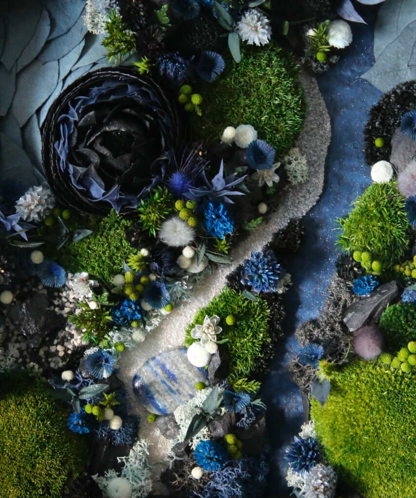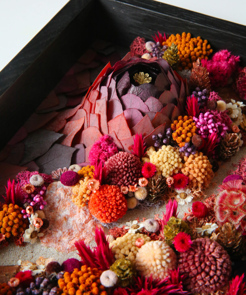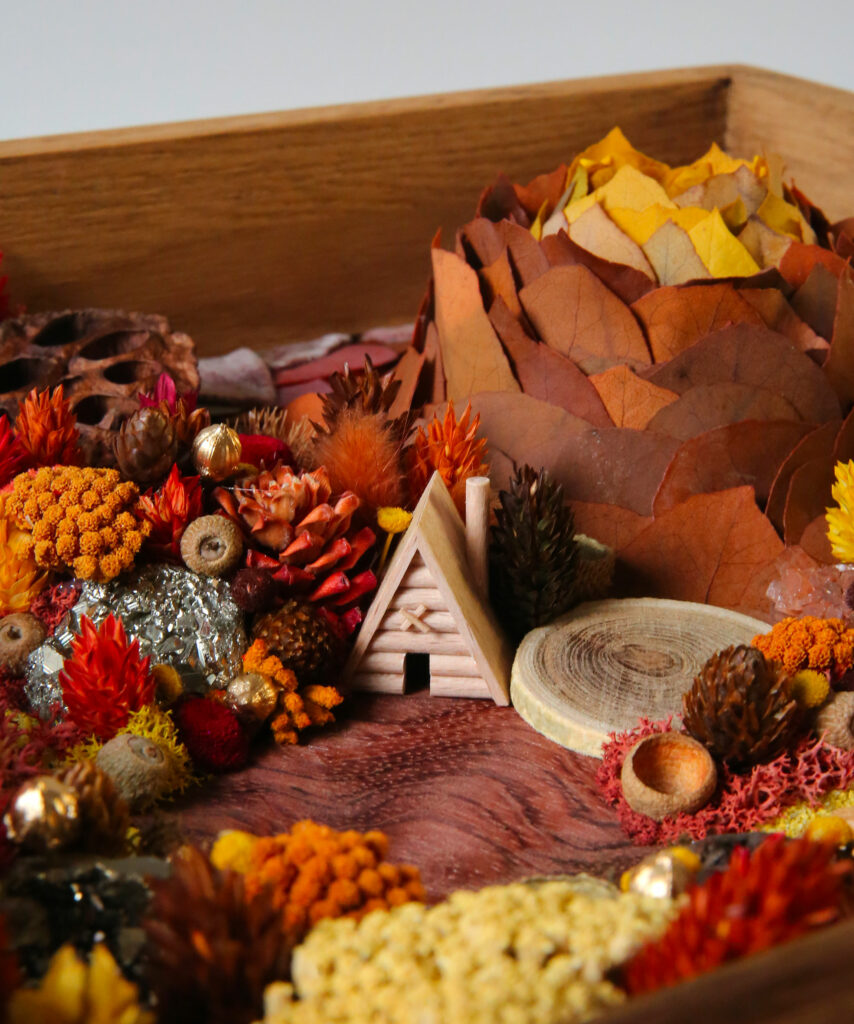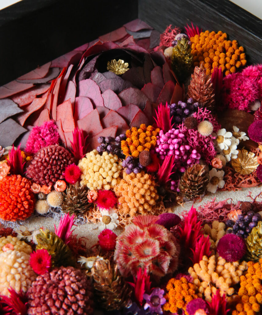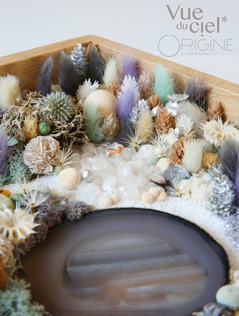 Composées de mousses, lichens, végétaux stabilisés, fleurs séchées, et enrichies d’éléments naturels comme graines, bois, fruits séchés, sable naturel et minéraux, ces œuvres offrent une interprétation poétique et détaillée de la nature.