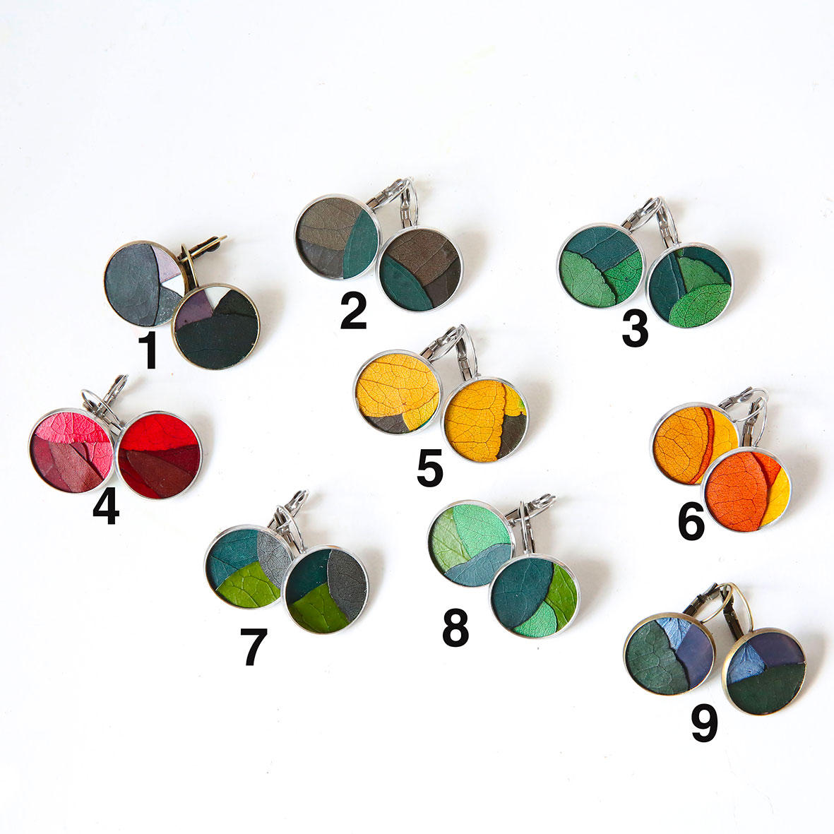 Bijoux fantaisie conçus à partir de fragments de feuilles stabilisées, intégrés à des supports en acier inoxydable.