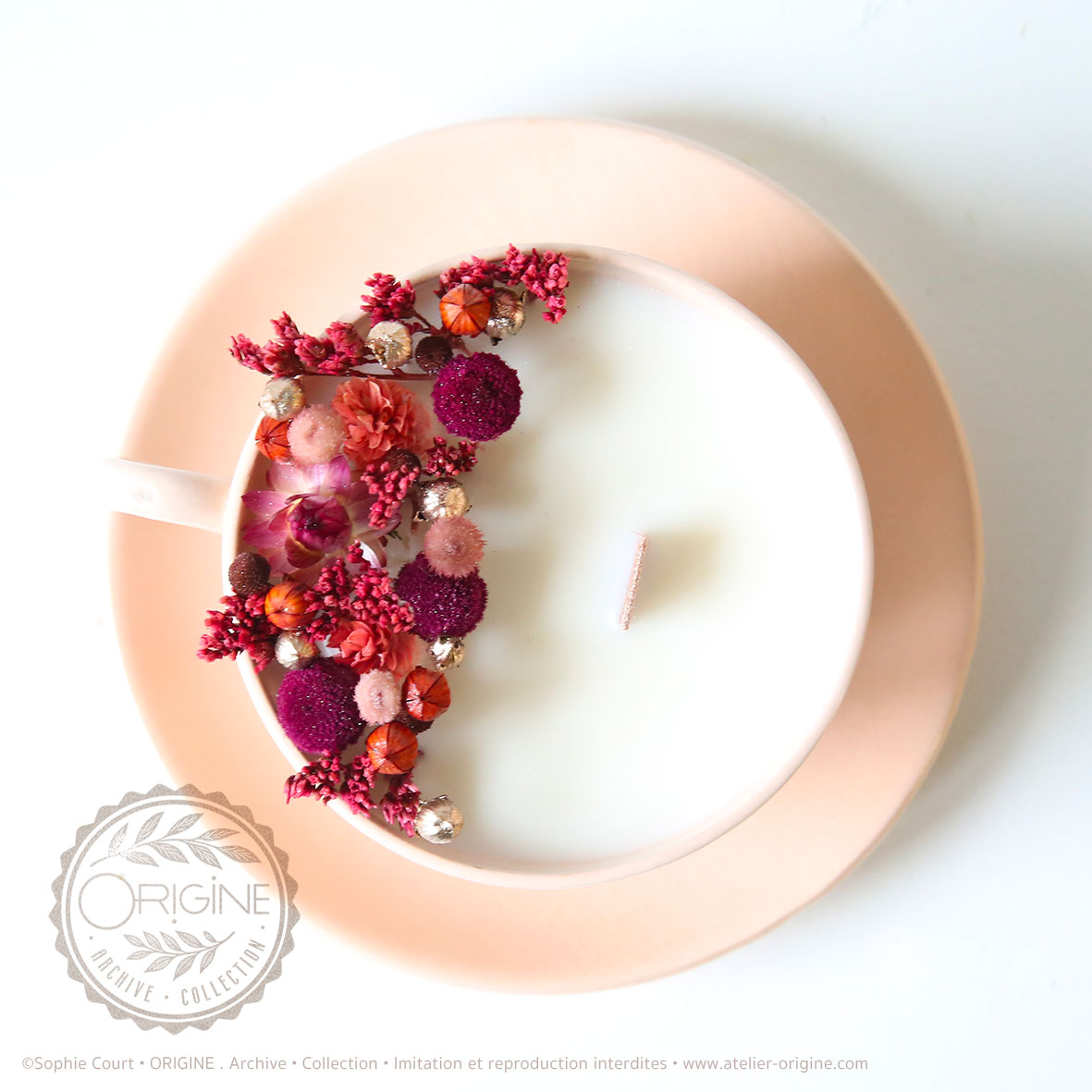 Une bougie naturelle façonnée dans une tasse ancienne, comme une cueillette de douceur et de mémoire.