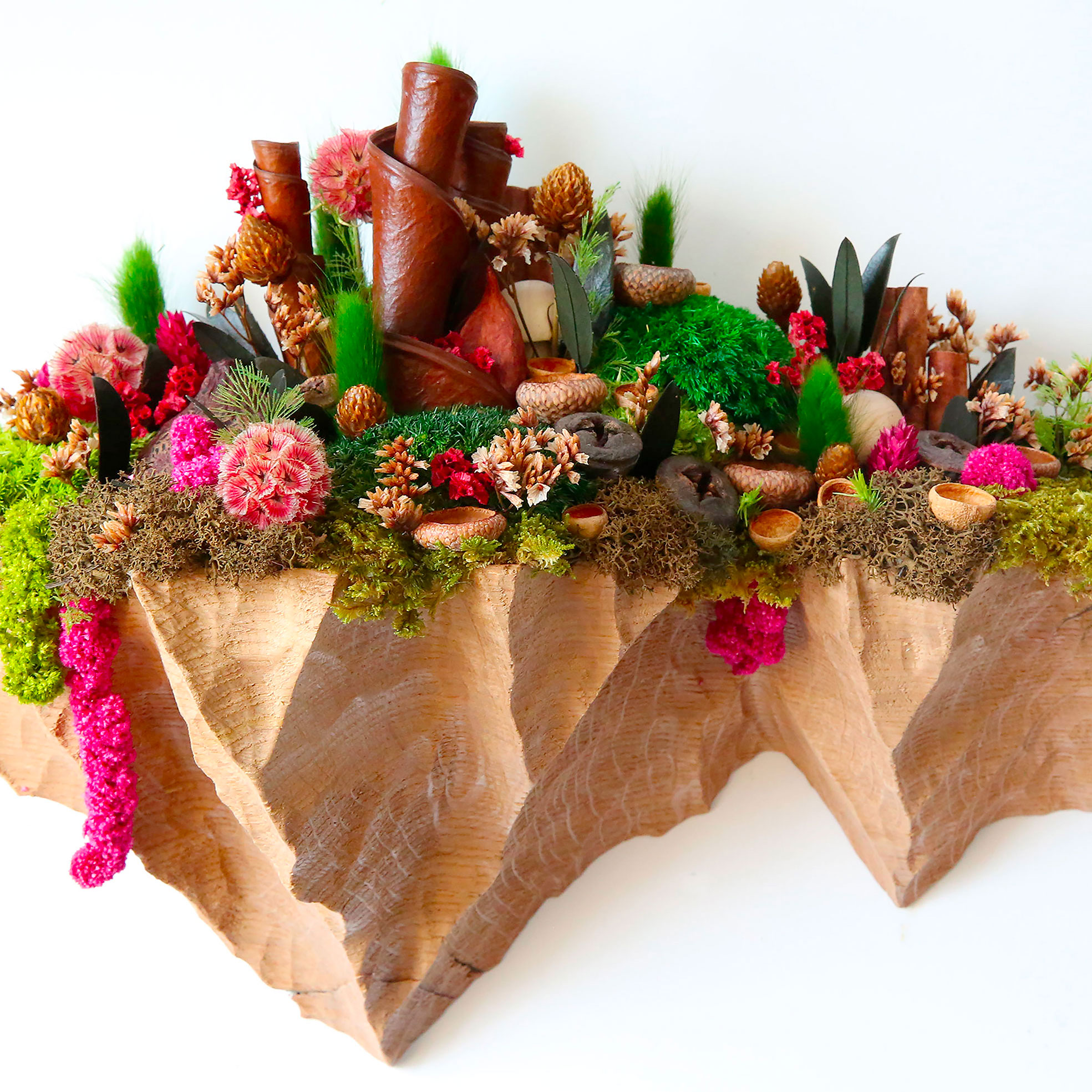 Sculpture en chêne massif. Végétaux stabilisés, préservés et séchés. Œuvre 100% NATUREL. L 40 H 28 P 14 cm