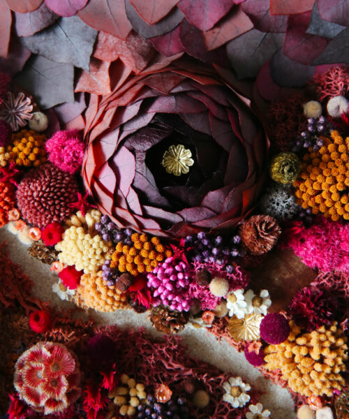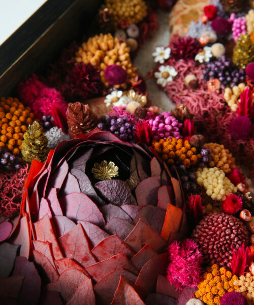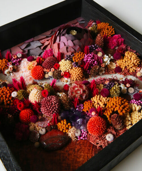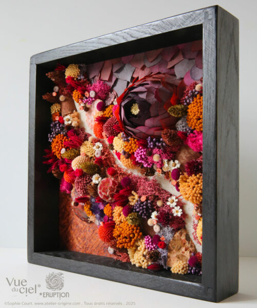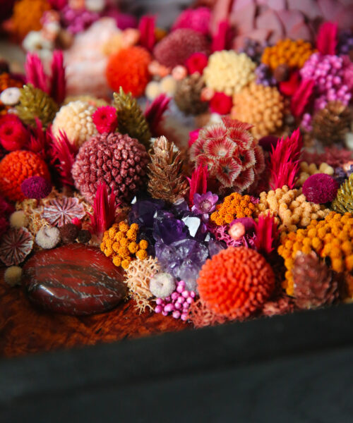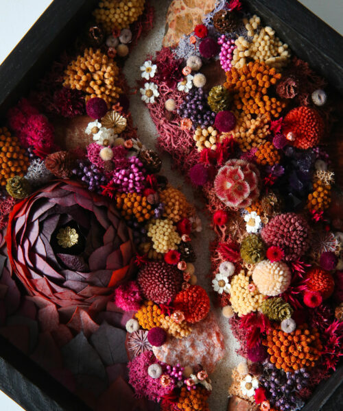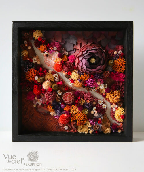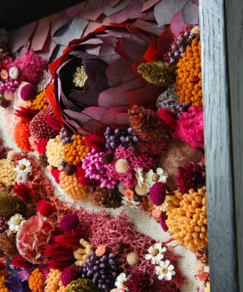 Cette œuvre réunit végétaux stabilisés et séchés, minéraux et bois précieux dans une composition aux allures de rêve hallucinatoire :