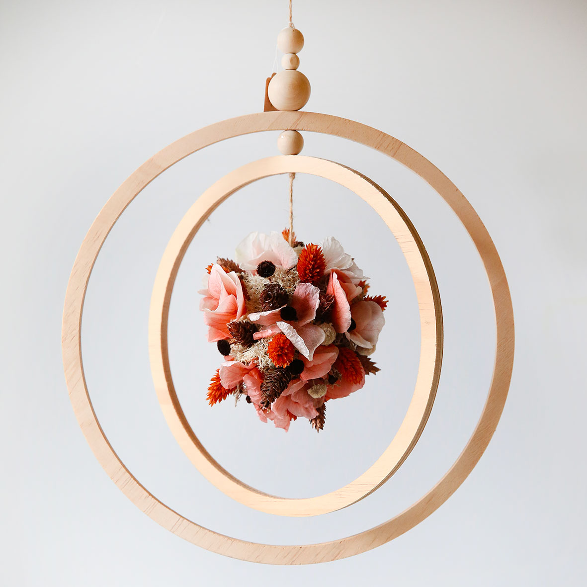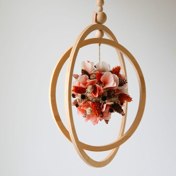 Suspension végétale originale. Joli mouvement des cercles en bois avec au cœur une boule fleurie de fleurs séchées.