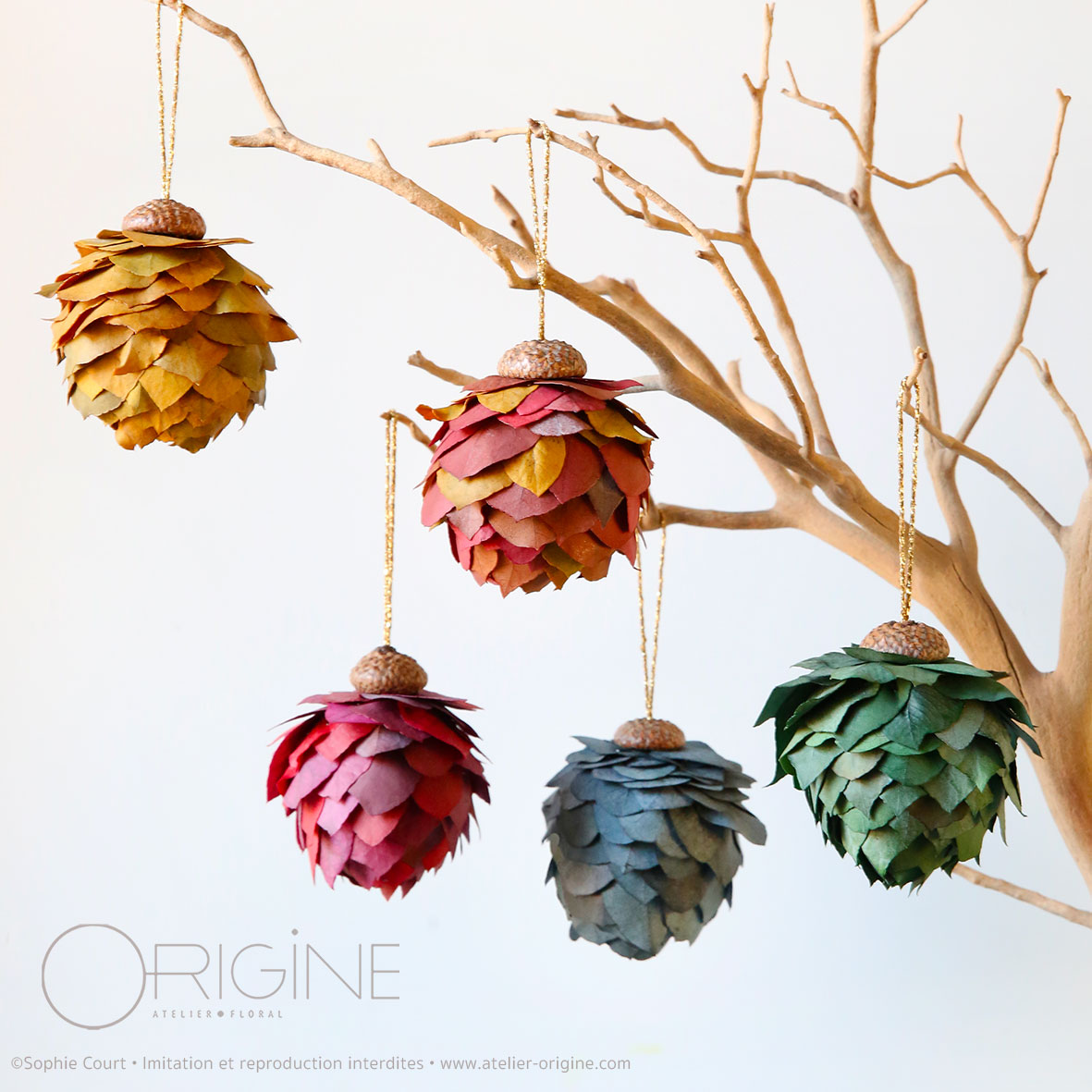 Chaque suspension est composée d’un chapeau de gland, de feuilles naturelles stabilisées et d’un fil doré.